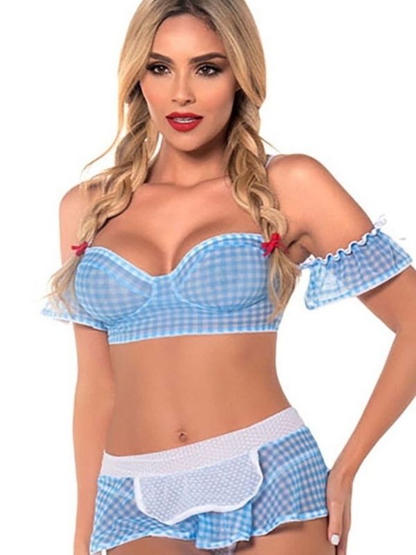 Büstiyer, etek ve stringden oluşmaktadır. Çorap paket içeriğine dahil değildir.