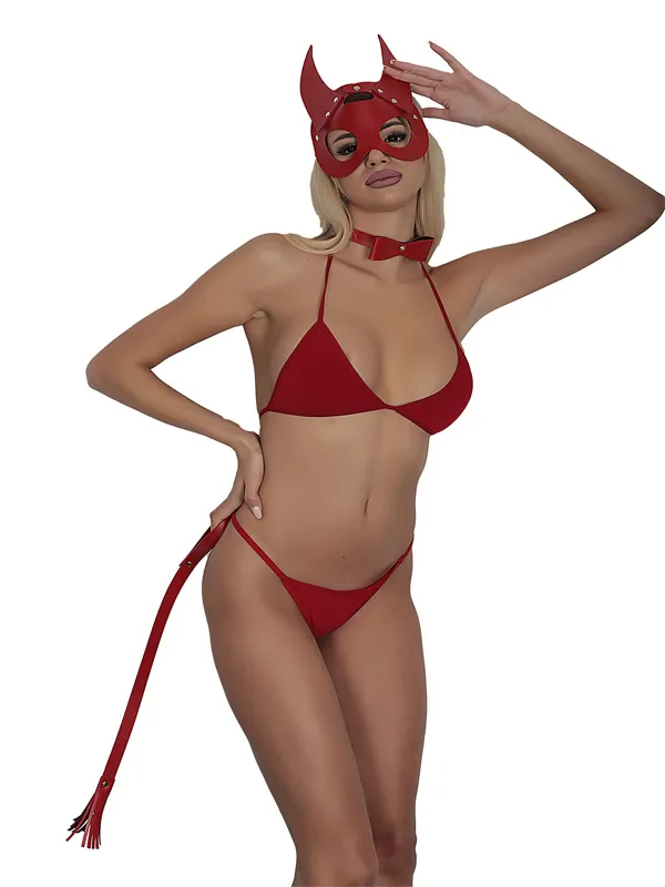 As Erotik Kırmızı Maskeli Deri 3'lü Harness Set Takım + İç Çamaşır Takımı